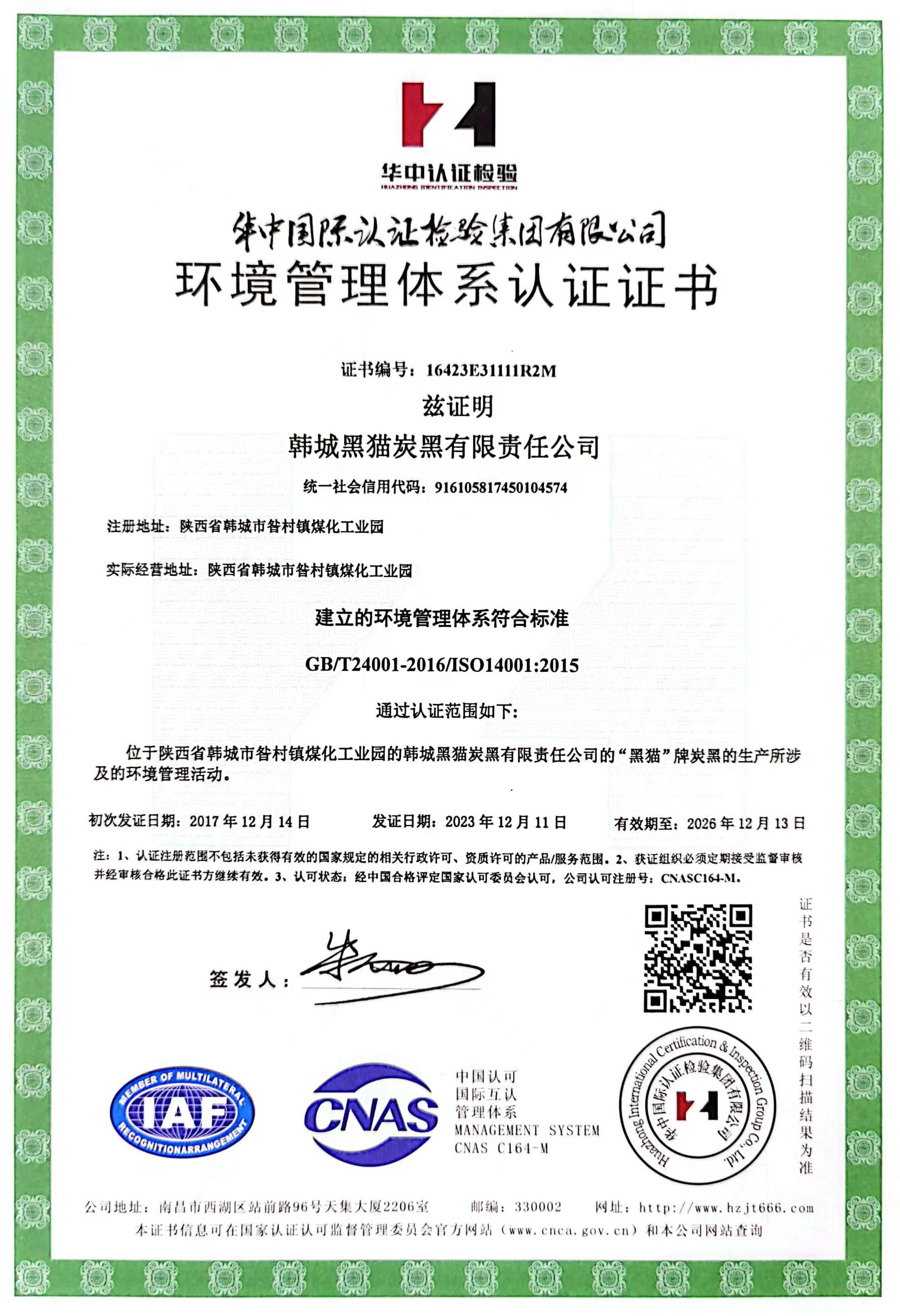 韩城黑猫炭黑有限责任公司资格证书