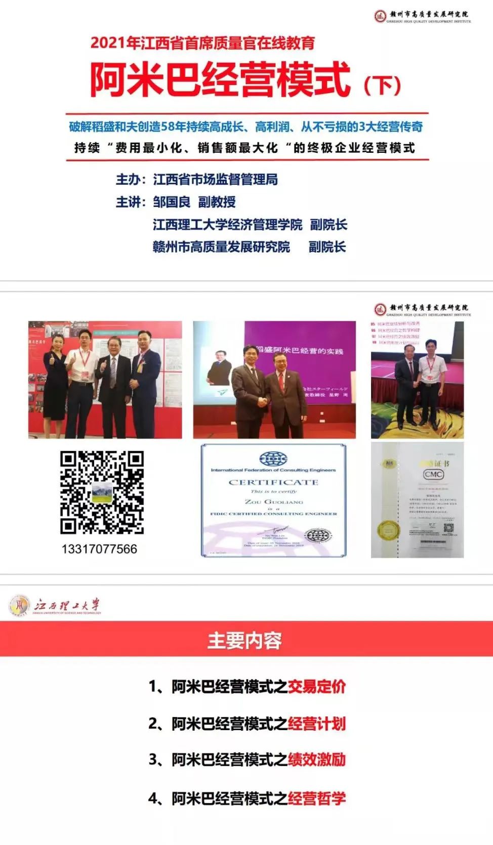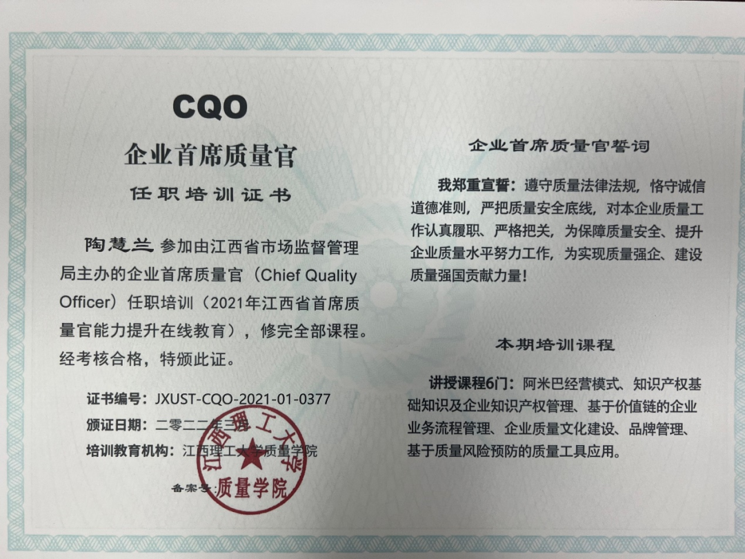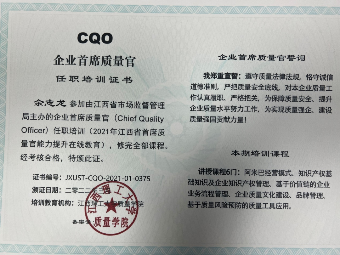 培训课程涵盖阿米巴经营模式、知识产权基础知识及企业知识产权管理、基于价值链的企业业务流程管理、企业质量文化建设、品牌管理及基于质量风险预防的质量工具应用。并根据《2021年江西省首席质量官在线教育考核方案》要求,经考核筛选后,公司三名学员优秀结业。