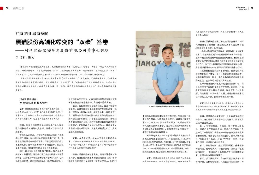 本期《中国石油和化工》杂志记者独家对话《中国石油和化工》杂志编委、黑猫股份掌舵人,万赢娱乐平台董事长魏明,深度剖析其从“传统炭黑”向“碳基新材料”跃迁的战略逻辑。这是一家行业龙头以技术创新为矛,以绿色发展为盾,向“国际一流的专业化学品制造龙头企业”目标发起的高端化突围实录。